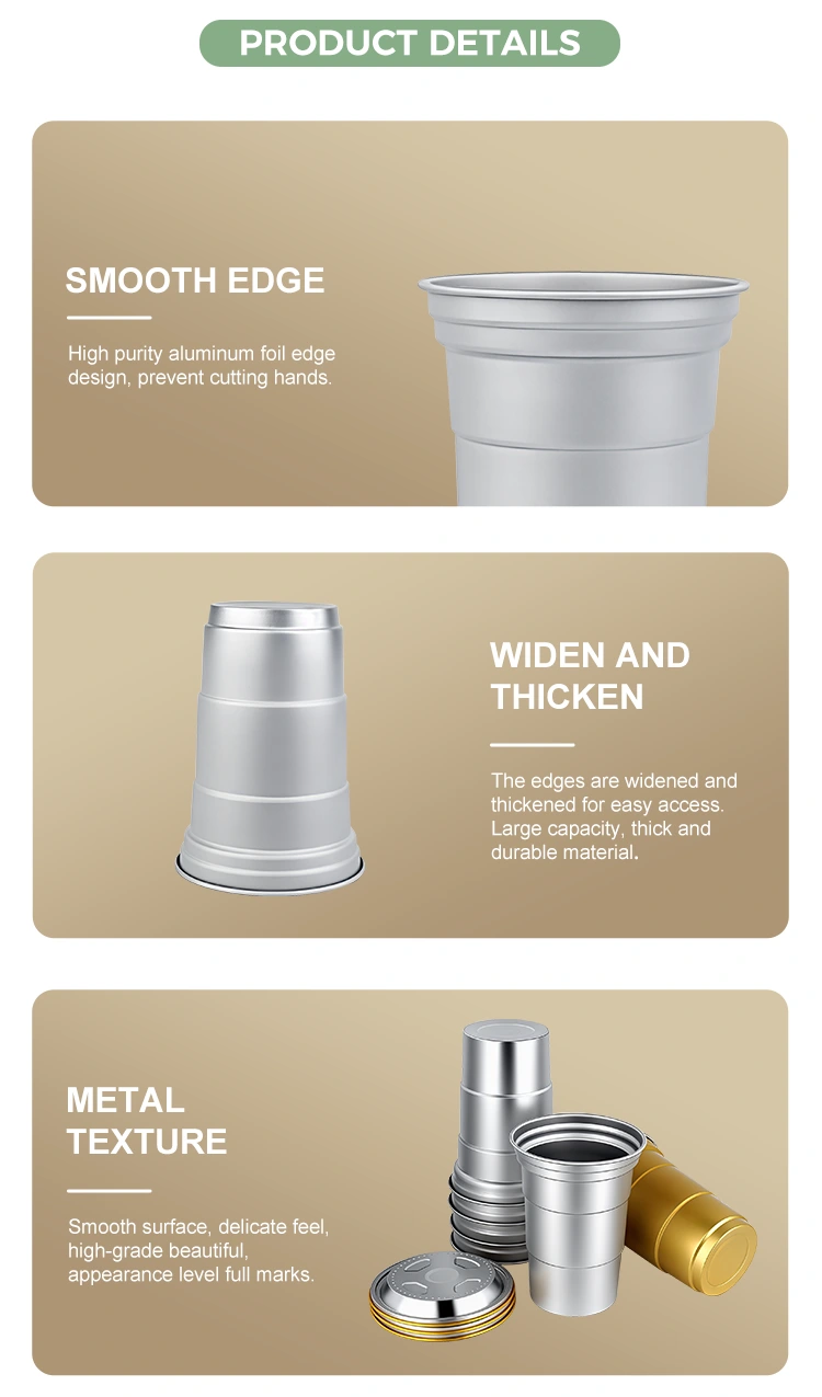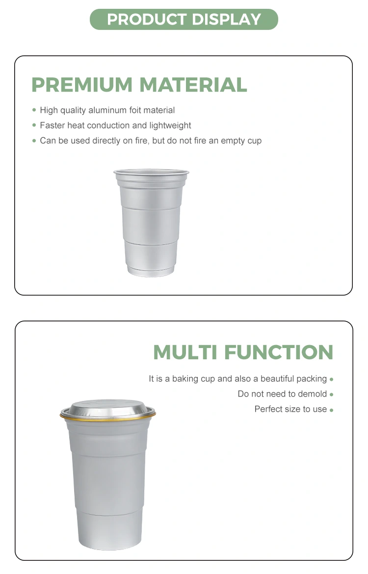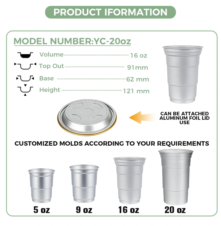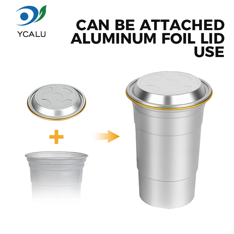 Spre deosebire de containerele generale, paharul personalizat pentru băuturi din folie de aluminiu de unică folosință Yunchu 16oz este special conceput pentru a oferi soluții de ambalare pentru mărci în scenarii specifice. Cu dimensiunea sa compactă (460 de mililitri), această ceașcă personalizabilă de unică folosință de 16 oz, din folie de aluminiu, răspunde obiceiurilor de consum ale băuturilor instant pentru o singură porție. Aceste pahare de petrecere din folie de aluminiu de unică folosință personalizate de 16 oz sunt potrivite în mod special pentru activități la pachet, piețe sau camping, dincolo de funcțiile sale practice. În primul rând, poate ajuta la creșterea valorii mărcii.
