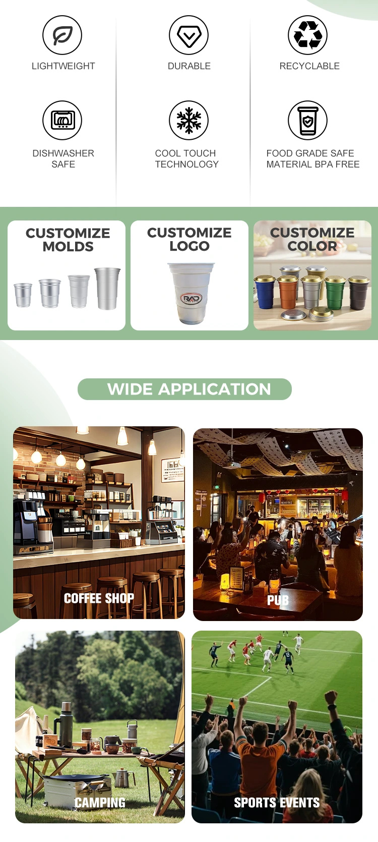 Scenarii de activitate comercială: expoziții, conferințe de presă, pauze de ceai de afaceri și alte ocazii. Această ceașcă de aluminiu poate fi folosită pentru a păstra băuturi precum apă minerală și apă spumoasă. Este ușor și ușor de luat, iar atributul său reciclabil se potrivește cu imaginea de birou verde a companiei. Poate fi folosit pentru a prepara mini cocktail-uri, pentru a ține whisky etc. în baruri și baruri transparente. Corpul cupei metalice poate transmite rapid răcoare, poate spori gustul de gheață al băuturilor și, în același timp, poate adăuga un stil la modă atmosferei clubului de noapte.