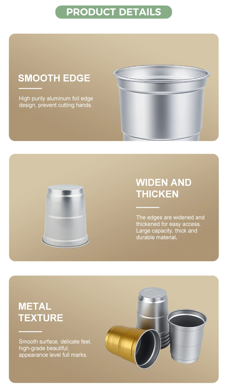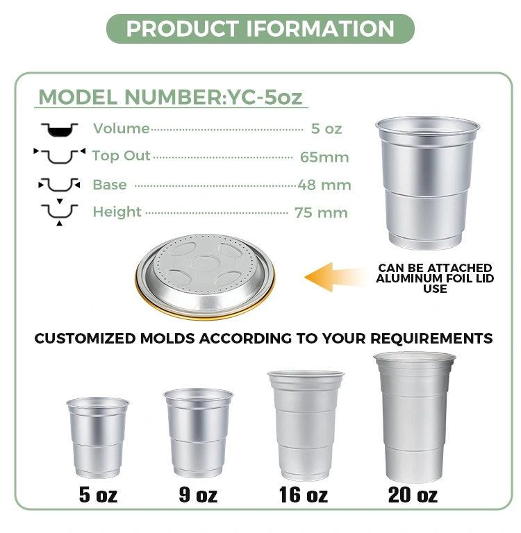 Băuturile reci reciclabile de unică folosință de 5 oz ale furnizorului de folie de aluminiu Yunchu. Cupa pentru băuturi din aluminiu este fabricată din aluminiu de înaltă calitate. Acestea sunt supuse unui proces strict de inspecție a produsului finit pentru a se asigura că nu sunt eliberate substanțe nocive și că respectă standardele de siguranță pentru produsele alimentare, făcând fiecare înghițitură sigură și fără griji. Corpul cupei adoptă un proces precis de întindere pentru a obține o grosime uniformă și o rezistență remarcabilă. Este ușor și portabil, dar nu se deformează ușor.