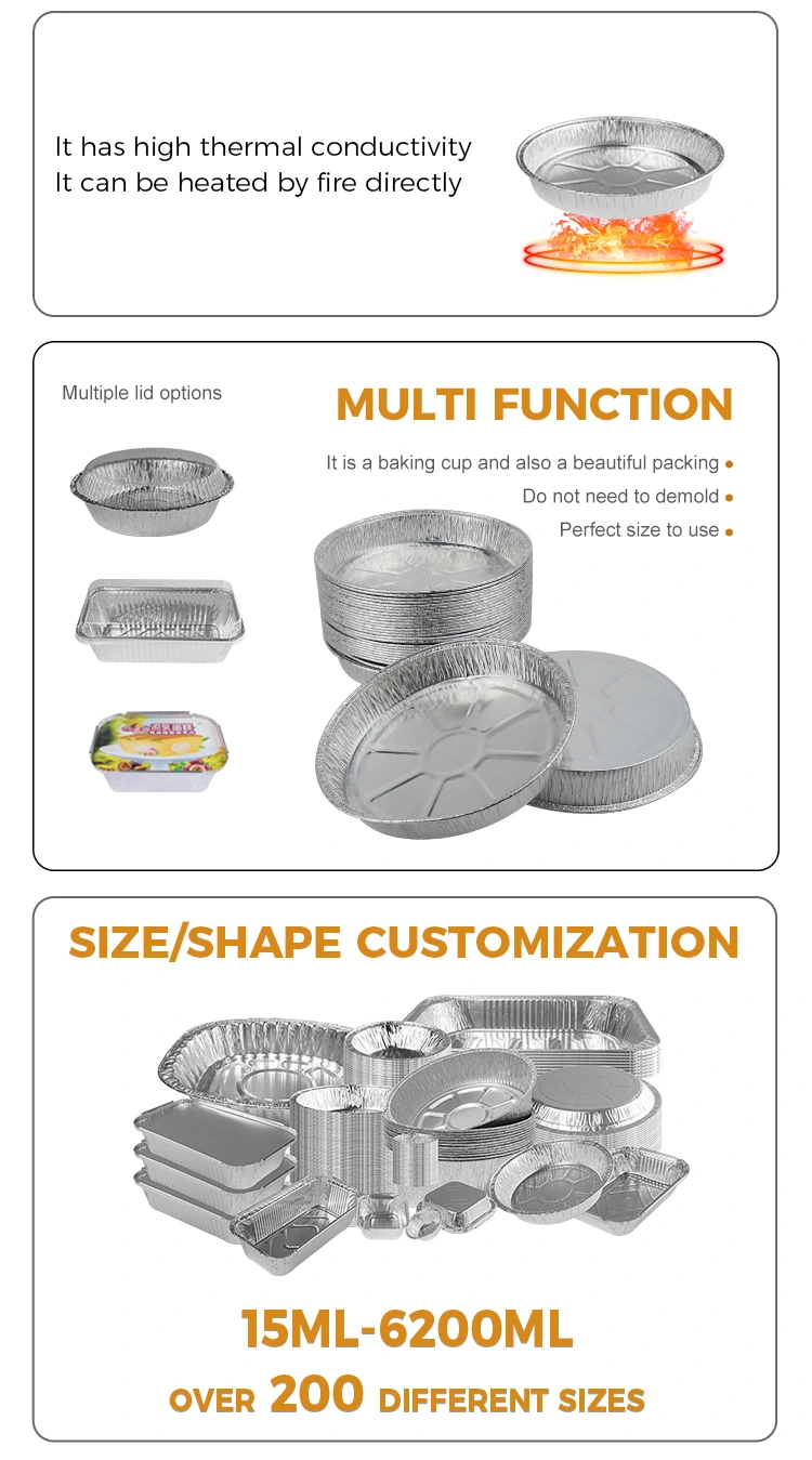 Recipientele de folie de aluminiu din aluminiu din aluminiu din aluminiu de argint de tip 5067 de tip 7 inch furnizate de fabrica de aprovizionare cu folie de aluminiu Yunchu este confecționată din material folie de aluminiu de argint de înaltă calitate, care are un aspect la modă și elegant și o performanță bună de conservare a căldurii. Proiectarea de mare capacitate a acestei pizza îi permite să găzduiască cu ușurință o varietate de alimente, indiferent dacă este un fel principal pentru o cină de familie sau o combinație multi-farfurie. Spațiul său mare de depozitare este suficient pentru a deține o cantitate mare de mâncare, fie că este vorba despre o adunare de familie sau o combinație multi-farfurie pentru a lua, poate fi ușor de acomodat fără să-și facă griji că nu are suficientă mâncare.