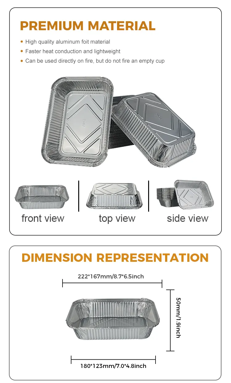 Cutia de prânz din folie de aluminiu de unică folosință de la Yunchu Aluminium Foil Factory, recipientul din folie de aluminiu argintie este potrivit pentru majoritatea scenelor, fie că este un restaurant cu grătar, un restaurant occidental, un restaurant gătit acasă sau o brutărie, această cutie de prânz din folie de aluminiu argintie poate îmbunătăți eficiența. Restaurantele cu grătar îl pot folosi direct pentru a servi frigărui la grătar, legume la grătar și fructe de mare la grătar. Aspectul argintiu este asociat cu ingredientele parfumate. Are un impact vizual complet și este atrăgător când este servit. Designul fără curățare reduce volumul de muncă de spălat vase în bucătărie și economisește costurile cu forța de muncă. Este potrivită în special pentru mese rapide în perioadele de vârf. Brutăriile îl folosesc pentru a servi prăjituri coapte, tarte cu ouă și biscuiți. Se pot coace direct în cuptor și nu trebuie coapte după ce au fost coapte. Schimbarea farfuriilor și plasarea lor direct pentru vânzare este convenabilă, menținând în același timp temperatura și forma deserturilor; Restaurantele gătite în casă pot fi folosite pentru mâncare la pachet, iar designul rezistent la scurgeri poate împiedica eficient scurgerea supei. Conservarea căldurii folia de aluminiu poate prelungi timpul de temperatură constantă a alimentelor. Pentru camping, picnicuri, grătare în aer liber și necazul de a transporta vesele voluminoase și de curățare după mese, această cutie de prânz din folie de aluminiu de unică folosință rezolvă perfect punctele dureroase ale călătoriilor în aer liber. Materialul este subțire și ușor și este ușor de depozitat. Poate fi pliat și stivuit după bunul plac, fără să ocupe spațiu în rucsac și făcându-l fără probleme de transportat.