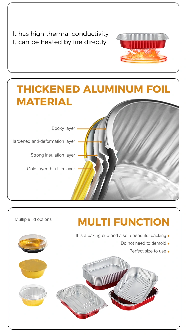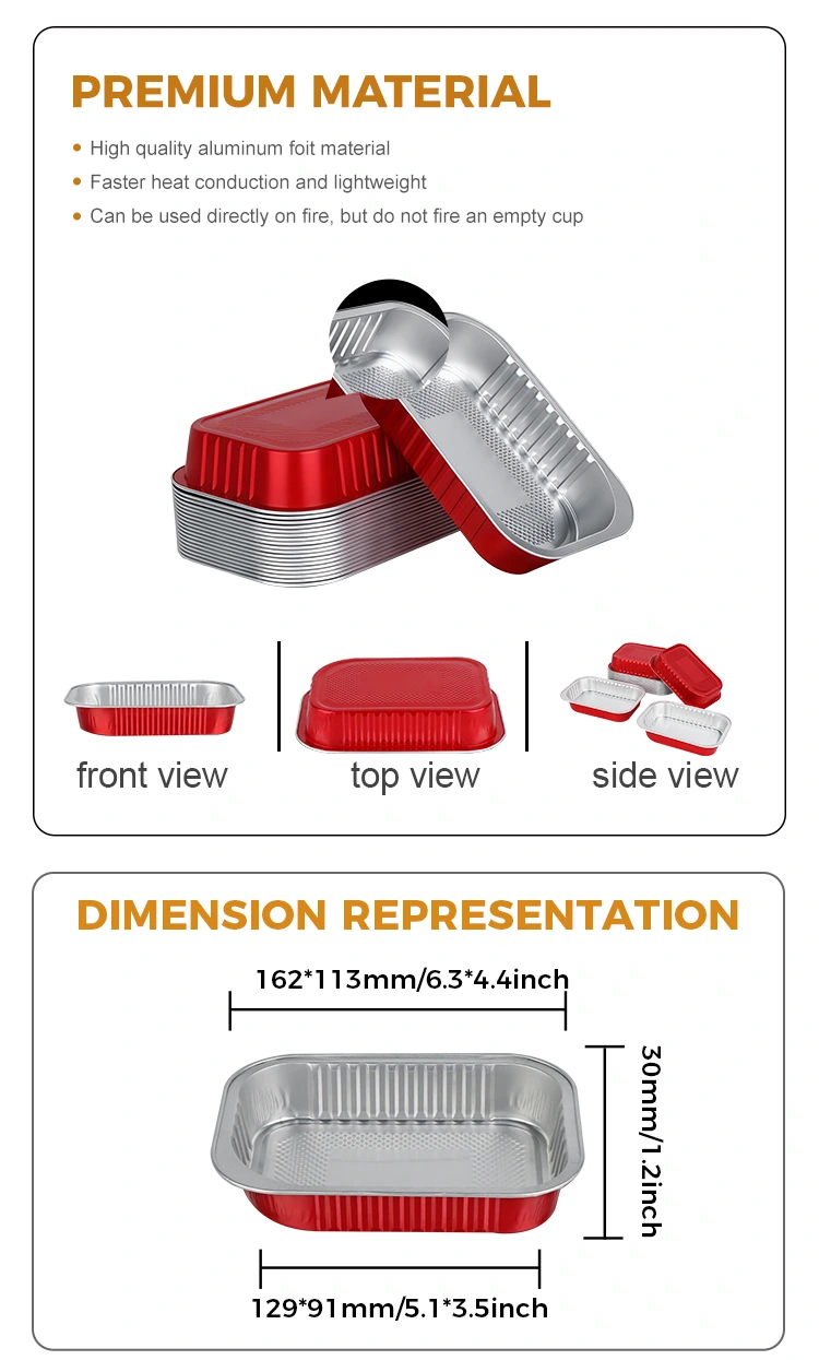 -Materialul recipientului pentru scoatere din aluminiu dreptunghiular roșu poate bloca prospețimea și prospețimea alimentelor. Proprietățile sale excelente de conducție a căldurii și de izolare îi permit să fie încălzit direct în cuptor, cuptorul cu microunde și refrigerat în frigider, păstrând în mod eficient aroma originală a mesei și menținând gustul ideal pentru o lungă perioadă de timp.