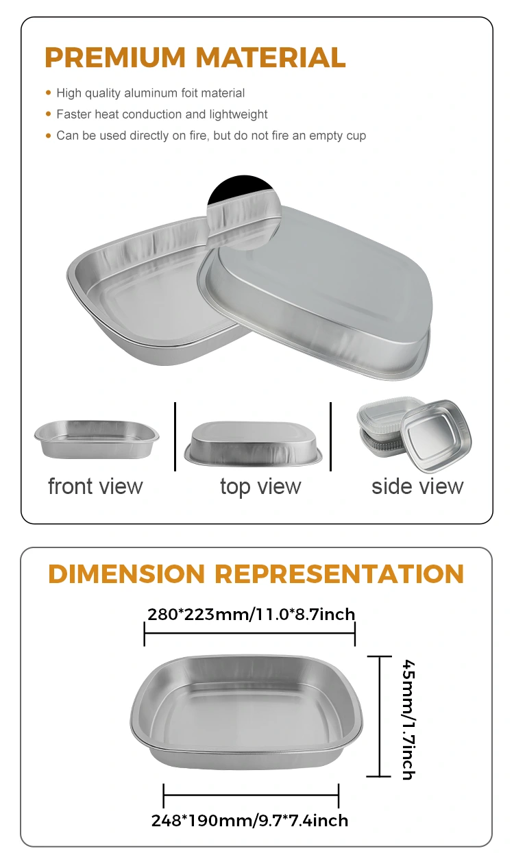 1. Cele mai noi recipiente din folie de aluminiu pătrate argintii de unică folosință pentru catering de unică folosință Yunchu au proprietăți de izolare remarcabile, asigurând că mâncarea rămâne caldă la livrare. Designul etanș reține în mod eficient umiditatea și aroma, restabilind gustul și aroma proaspete și suculente ale alimentelor așa cum erau atunci când au fost gătite.