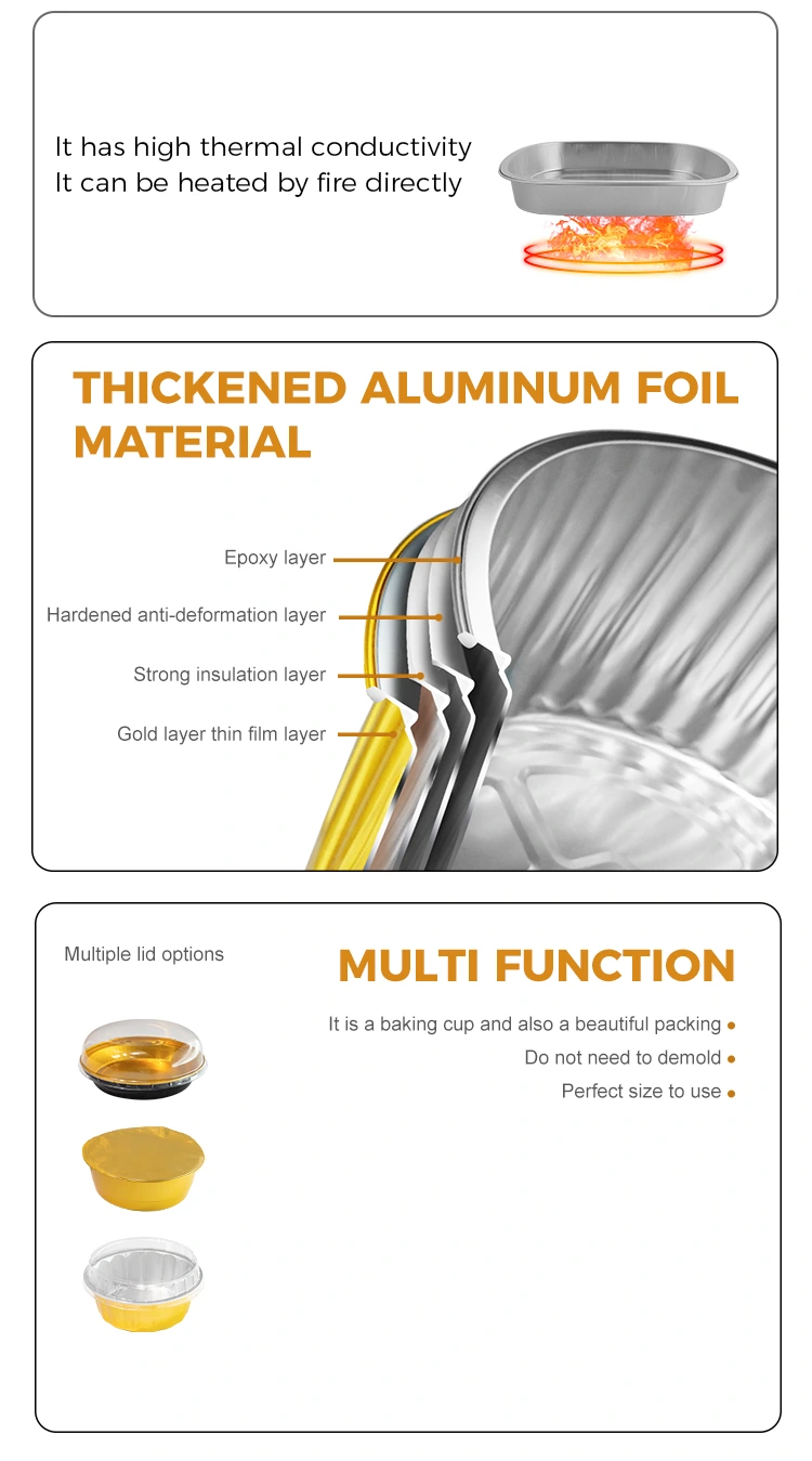 Este ambalajul perfect pentru tarte cu ou, brownies, cupcakes, felii unice de pizza sau produse de patiserie. Proprietatea de izolare a foliei de aluminiu ajută la menținerea căldurii și texturii moale a produselor de patiserie imediat după ce sunt coapte; își păstrează perfect aroma și este potrivită pentru mâncare la pachet din brutării și cafenele.