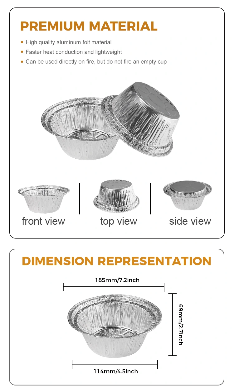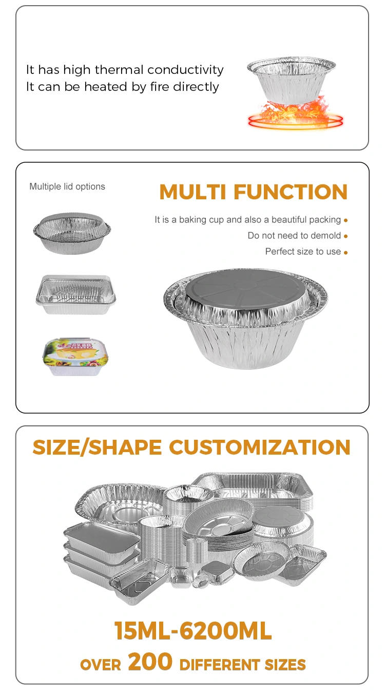 Yunchu aluminum foil supplier Round small package baking Silver Aluminum Foil Food Container is made of food-grade aluminum foil material, after the inspection of the company's food certification, the material is thickened, can be made oil-proof and non-sticky, effectively solving the problem of washing the pot, this disposable baked rice takeaway silver aluminum foil container can be used for gas stoves, charcoal fire, oven, Cuptorul cu microunde, cutia întreagă, poate fi utilizat pe flăcări deschise, materialul îngroșat al cutiei de folie de aluminiu nu este ușor de deformat, produsele cutiei din folie de aluminiu utilizate sunt din plastic și va fi mai convenabil de utilizat atunci când se utilizează. Mâncarea poate fi fabricată într -o varietate de moduri de a vă satisface condițiile de producție. Există o varietate de stiluri din care să alegeți, pentru a satisface nevoile diferitelor utilizări, două tipuri de capac din care să alegeți, capacul transparent din folie de aluminiu, material din plastic, capacul transparent nu este ușor de cea mai mare cu 1-2 cm mai mare decât cutia de prânz (nu poate fi utilizat la temperatură ridicată), capac de folie de aluminiu, copertină de film de aluminiu de argint (Can, cu temperatură înaltă).
