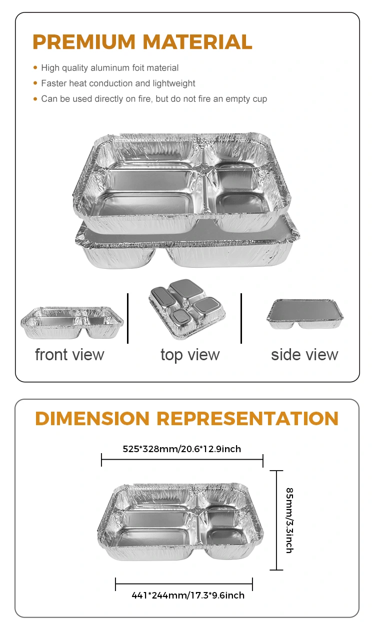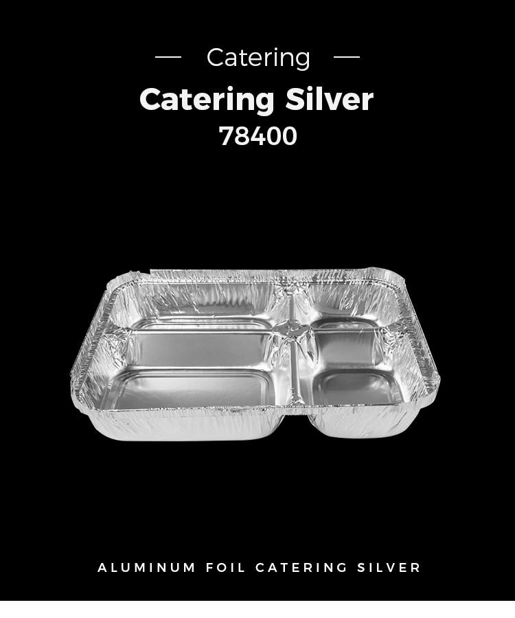 Fabrica de aprovizionare cu folie de aluminiu Yunchu a lansat un nou containere de folie de aluminiu din aluminiu de argint de aluminiu cu mai multe compartimente de unică folosință, număr de modele 78400. Containerul este proiectat în mod inteligent, cu un diametru superior de 244 mm (9,6 in) și 195 mm (7,6 in) și un diametru mai mic de 217 mm (8,5 in) și 168 mm (6,6 in), cu o înălțime de 217 mm (8,5 in) și 168 mm (6,6 in), cu o înălțime de 217 mm. în). Cu o capacitate de aproximativ 1020 ml (36,0 oz), este convenabil și practic pentru deținerea unei varietăți de alimente în patru compartimente.