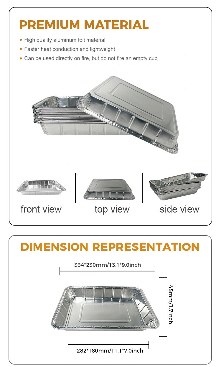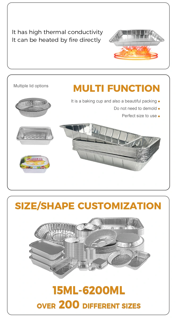 Furnizor de folie de aluminiu Yunchu Recipient de folie de aluminiu din aluminiu de argint, satisface o varietate de nevoi de gătit, potrivite pentru diverse ocazii, cum ar fi prăjitoarele de aer, grătarul de grătar, cuptoarele de rotisserie și fabricarea fructelor de mare. Acest recipient cu folie de aluminiu este special conceput cu o margine ridicată pentru a preveni eficient alimentele să se vărsă și să se lipească de peretele oalei și protejează căptușeala cu mai multe straturi, care este practic și fără griji. Este confecționat dintr-un material de 8011-0 de calitate alimentară, cu o temperatură rezistentă la căldură de până la 520 ° C, nu înfiorată sau ruptă, iar materialul îngroșat face nu este ușor de deformat. Cutia de folie de aluminiu este îngroșată în ansamblu, astfel încât să o puteți ridica cu ușurință după gătit, fără să vă faceți griji cu privire la deformare în timpul utilizării. Designul tivit îl face confortabil de ținut și marginile sunt rotunjite, așa că nu trebuie să vă faceți griji cu privire la zgârierea degetelor. Marginile netede sunt completate de PET Capace complet transparente și capace de folie din folie de aluminiu, ceea ce le face mai potrivite pentru o varietate de metode de gătit.
