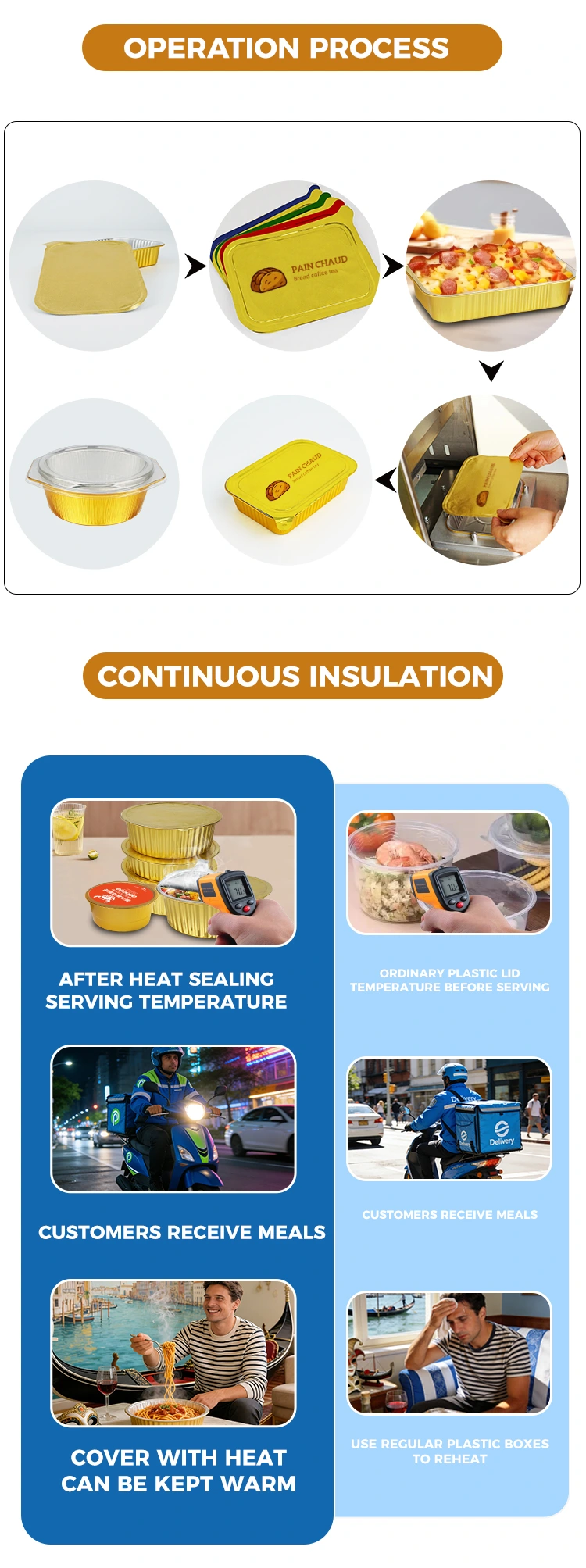 Mai eficient: nu este nevoie de asociere cu folii de etanșare separate. Cutiile de prânz și dispozitivele de etanșare sunt gata de utilizare imediat. Funcționarea manuală nu necesită așteptarea preîncălzirii. Comenzile cu loturi mici pot fi procesate rapid, iar comenzile mari pot fi, de asemenea, avansate în mod constant. Poate gestiona cu ușurință scenarii precum orele de vârf pentru mese și creșterile bruște ale comenzilor de festival.