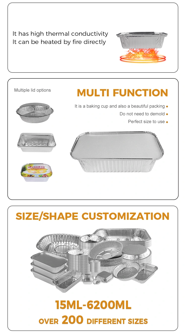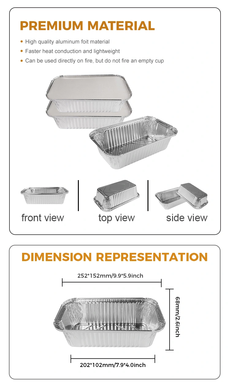 FOLOASTA ALUMINUMĂ YUNCHU Această friteuză de aer dreptunghiulară care ambalează recipiente din folie de aluminiu de argint este confecționată dintr-un material de folie de aluminiu de înaltă calitate 8011, care are performanțe excelente de izolare a căldurii și poate menține efectiv temperatura alimentelor, ceea ce face ca alimentele să fie mai delicioase și delicioase. În același timp, recipientul nostru dreptunghiular de folie de aluminiu de argint BBQ este echipat și cu o funcție de conservare a căldurii, care poate fi obținută prin potrivirea acestuia cu un capac de folie de aluminiu sau un capac de plastic pentru animale de companie, care este convenabil pentru logo -ul personalizat și, astfel, îmbunătățește imaginea mărcii.