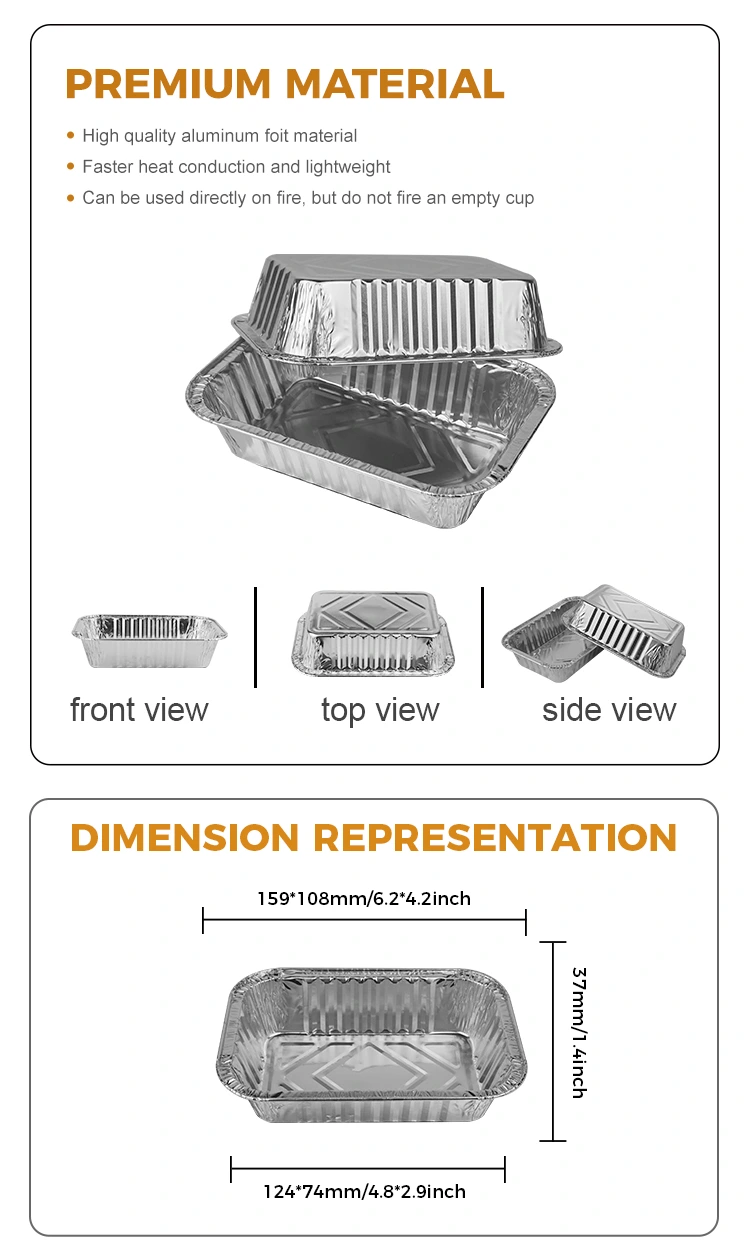 Datorită designului său mic și ușor, acest container de folie de aluminiu de argint de argint este perfect pentru transportul și depozitarea alimentelor, potrivit pentru utilizarea și personalizarea magazinelor alimentare în magazine, restaurante fast -food, etc. Este non-alunecare și durabilă, iar cutia de folie de aluminiu este îngroșată și întărită, îmbunătățindu-și capacitatea de a rezista la presiune și rămâne stabilă chiar și în timpul transportului și nu este ușor de deformat.