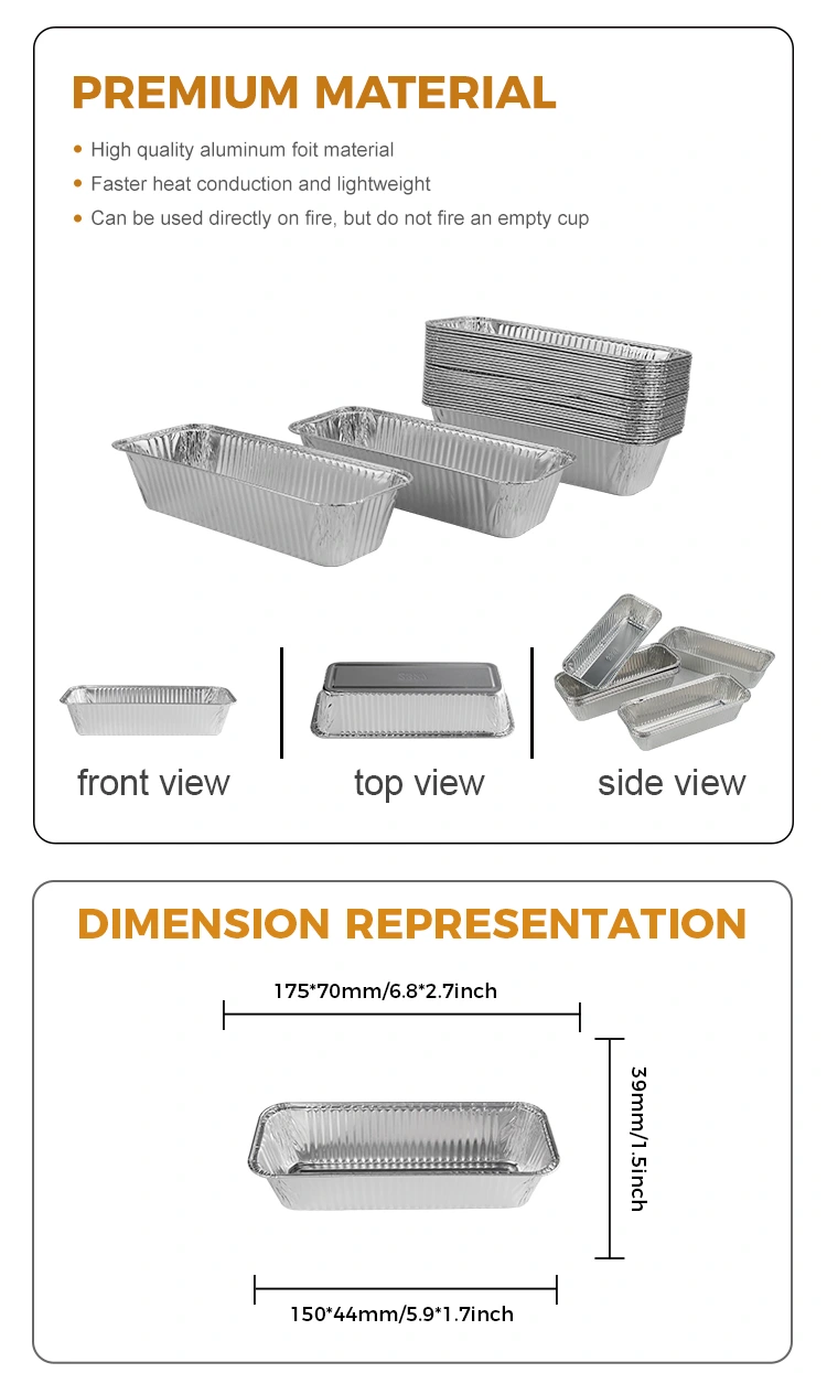 Containerele de folie de aluminiu din aluminiu din tavă dreptunghiulară de pâine furnizată de furnizorul de folie de aluminiu Yunchu este fabricat din materiale de calitate alimentară și este potrivit pentru o varietate de scenarii de aplicare. Acest produs este deosebit de potrivit în scopuri de grătar și coacere, cum ar fi realizarea de pâini sau coacere lungi. Indiferent dacă este pentru grătarul cărbunelui sau ca o cutie de livrare a livrării, este perfect pentru utilizare.