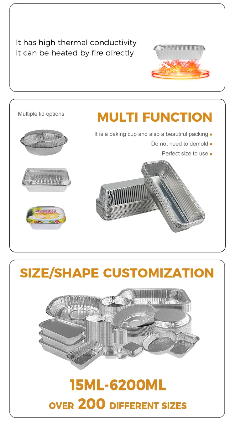Caracteristici: Containerele de folie de aluminiu din aluminiu de argint este sănătoasă și ecologică, folosind materiale de calitate alimentară, sigure și non-toxice, folosind materiale regenerabile și ecologice, concentrându-se pe siguranța alimentelor și urmărind calitatea generală a produsului.