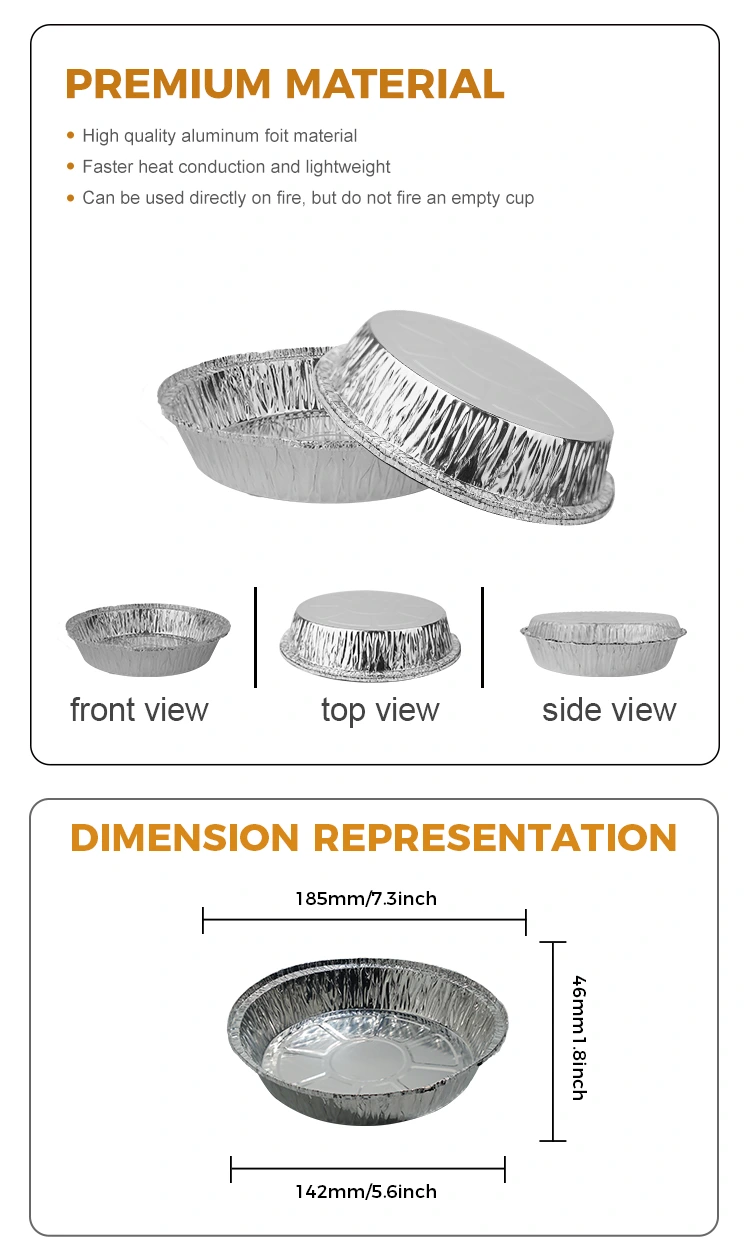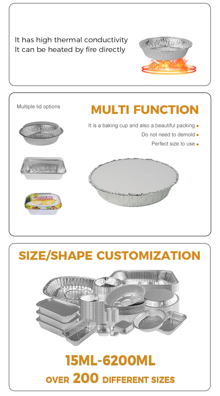 Caracteristici: modelare dintr-o bucată de modelare îngroșată și rezistentă la copt, adoptând materialul de folie de aluminiu de grad de contact alimentar, asigurați-vă că este asigurat de a contacta alimentele, nu ușor de deformat și nu scurgeri, grosime puternică, rezistență la coroziune, rezistență la temperatură ridicată.
