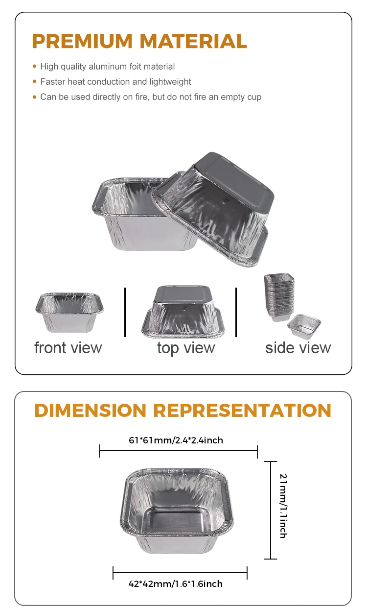 Foil de aluminiu Yunchu Forterul pătrat Fryer Fryer Silver din folie din aluminiu care pot fi utilizate în prăjitoare de aer, prăjituri mici, încărcare mică de alimente, livrare de preparare etc., și pot fi utilizate pentru sosuri, scufundări, condimente mici și probe de copt. Pentru a vă asigura că recipientul cu folie de aluminiu cu capacitate mică încărcat în recipient este proaspăt, este fabricat din 8011 material de folie de aluminiu de argint de calitate alimentară 8011, care este integral modelat, iar suprafața peretelui este netedă și curată ca o oglindă, care este atât frumoasă, cât și practică, iar designul de margine nu vă afectează mâinile, iar dimensiunea este bogată și potrivită pentru o varietate de scene.